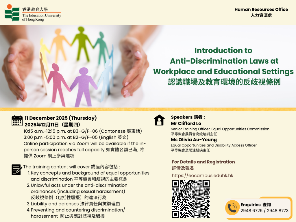 關於 本培訓工作坊旨在加深教職員對職場及校園中可能出現的歧視和騷擾問題的認識與了解。透過真實個案分享、重點法例 […]